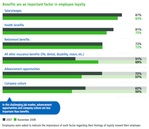 MetLife’s 7th Annual Study of Employee Benefit Trends shows that health, retirement and other insurance benefits are incredibly important factors in employee loyalty, much more so that the previous year. At the same time, advancement opportunities and company culture have decreased in importance from the previous year. Also important: